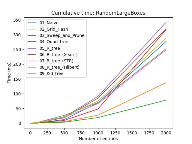 Obviously, we’re more interested in how the lines behave as $n \to \infty$. The interesting thing (although not that surprising) is that Sweep and prune outperforms all other data structures, except for the XLine test. This makes sense, as the variance along the $x$-axis in that test is very low, so sorting and pruning accomplishes nothing. On the other hand, Sweep and prune is extremely performant in the YLine test, where the $x$ variance is large. Like we’ve discussed before, this irregular behavior can be remedied by checking which axis to use before the algorithm begins.