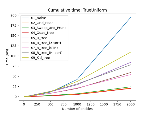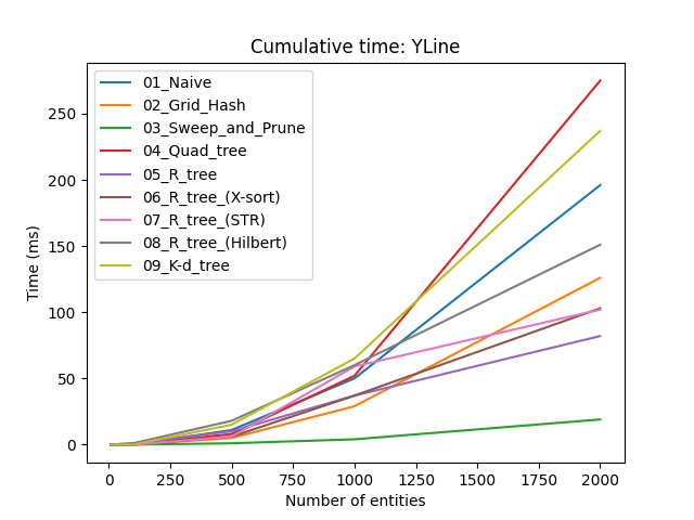 A strange phenomenon is that the Quad tree performs much worse in YLine than in XLine, even though the quad tree is an unbiased data structure. I first thought it was because the test area is $800\times600$ pixels big, the entities would spread out more along the $x$ axis which helped reduce overlap, especially because the entities are the same size with swapped axes in the two tests, so there would be greated overlap along the $y$ axis. Even after using the same dimensions for both axes, the YLine test performed slightly worse (but way better than before). I’m not sure why this is the case yet, but it goes to show that the choice for hyperparameters is very important.