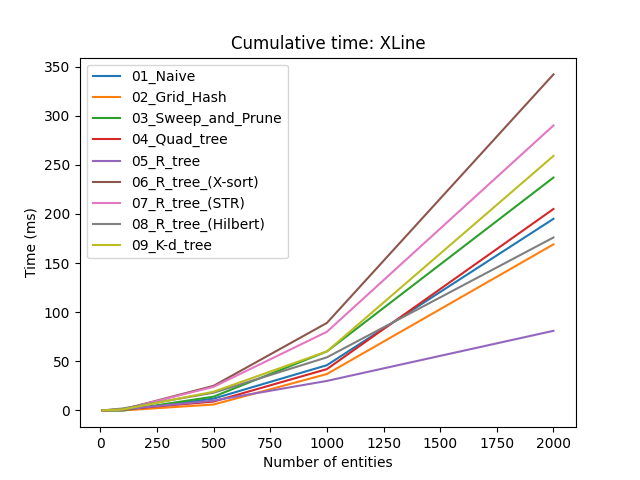 R-trees have an unimpressive performance, especially the standard R-tree. Bulk-loading helps as it eliminates the need to reinsert nodes and keep the tree balanced. Amongst the bulk-loading strategies, X-sort has the least overhead and produces satisfactory results. The only exception is the XLine test, for the same reason as why Sort and sweep behaved poorly in that test; we can use the same tactic of deciding the axis before sorting to improve performance.