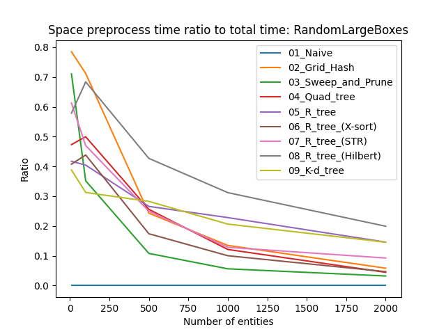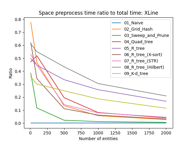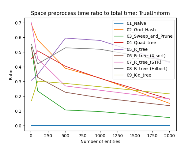 Second, each iteration of this test runs for one single frame. If it were run multiple times, then the auxilliary data structures would have to get reconstructed each time. Since the entities are assumed to be static, that would be a waste of processing time. We could cache the data structures between frames, making use of the temporal coherence assumption where very little would change between two consecutive frames. In fact, this would be the best approach for a dynamic environment. Many of these data structures, especially R-trees and K-d trees, support inserting and removing elements which is in general cheaper than reconstructing the entire tree. In fact, let’s analyze how much time is spent building the data structure over to the total time spent. The charts below plot out the behavior.