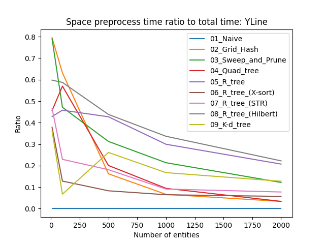 A ratio of $0$ is ideal and means that the entire processing time was spent on finding the collision candidates. The naive approach has no preprocessing so it achieves this ratio. All other structures perform some combination of sorting, hashing and building trees. Larger ratios are better, because if we can optimize those, then the total time will be much smaller. As we can see, R-trees have the most potential of being optimized through caching, while K-d trees are a close runner up.