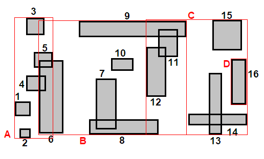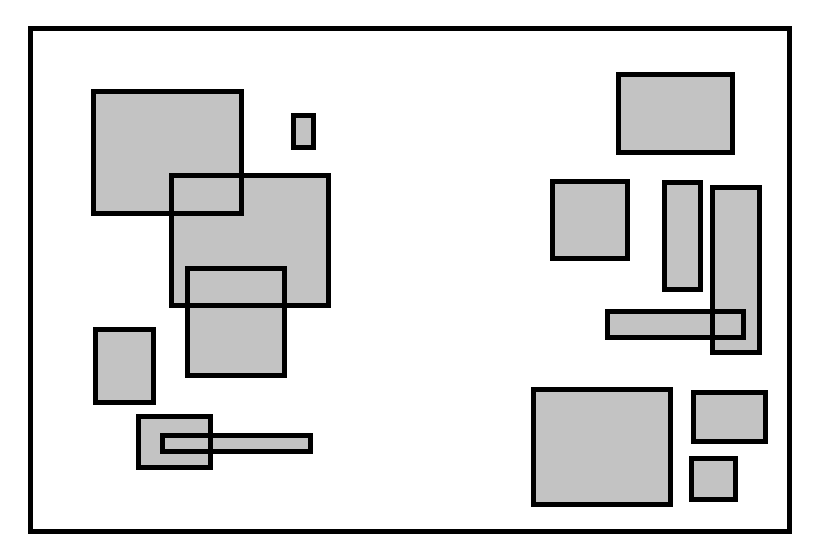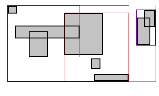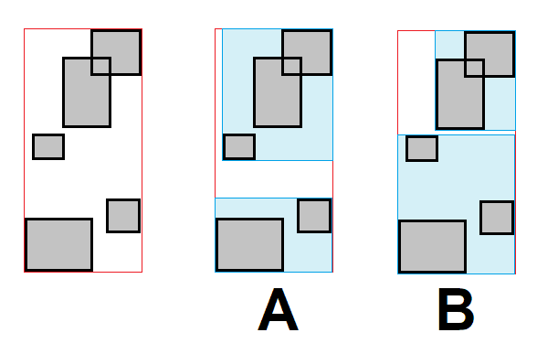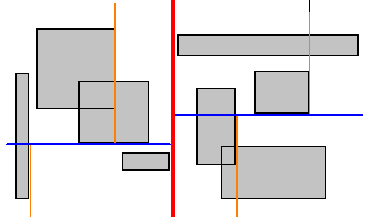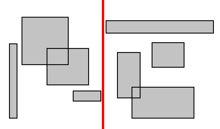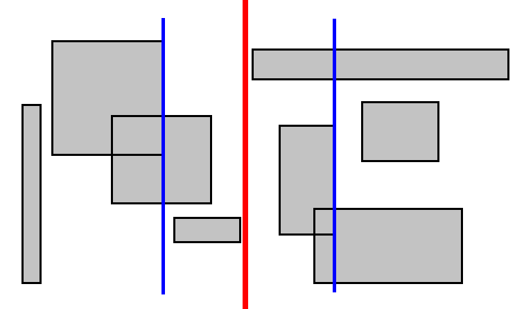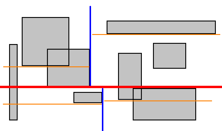 In the naive approach section, I briefly touched upon an idea of splitting the entire space into two different subregionsn and by doing that, we were able to reduce the total number of computations. The method of splitting assumed there were two disjoint clusters of rectangles, which isn’t always the case. While that wasn’t a practical solution, the idea of splitting a region into two could be utilized in a different way.