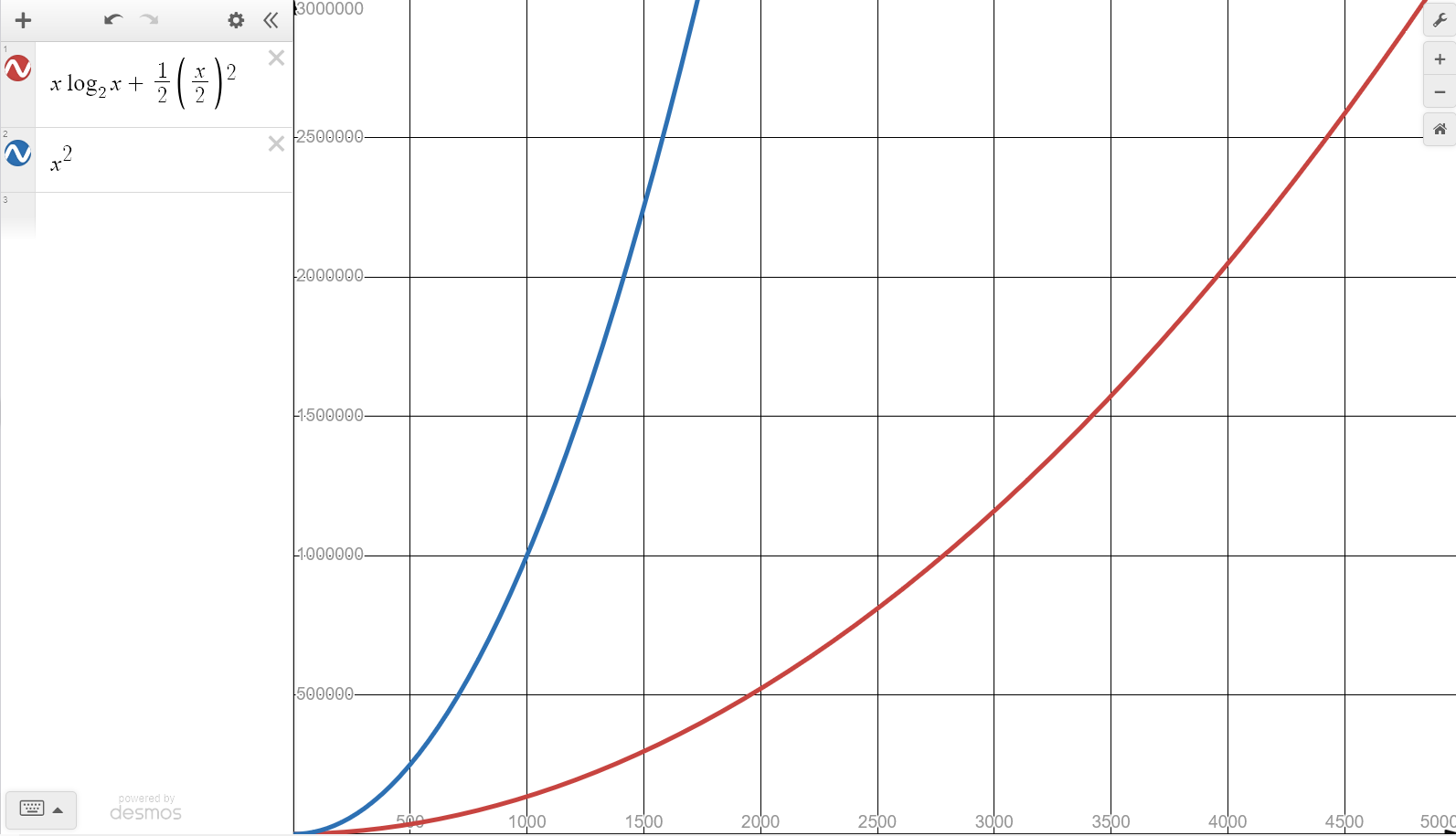 To obtain these clusters, we’d sort the rectangles along the $x$ axis and draw a line between the two adjacent rectangles with the furthest distance along the $x$ axis. Sometimes it may be better to split along the $y$ axis instead. We can determine the better axis in linear time by computing the variance along each axis. In an ideal case, this amounts to $n\log(n) + \frac{n^2}{2}$. That’s $O(n^2)$, sure, but look at this graph: