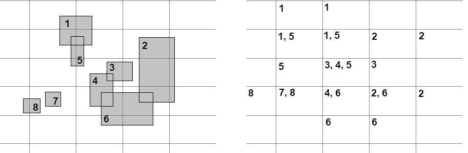 The left side shows the grid and a 8 rectangles (each of which is labeled). The right side shows the grid and inside each cell there’s a list of labels representing which rectangles are included in that cell. For each cell, we check for collision between rectangles in that cell’s bucket.