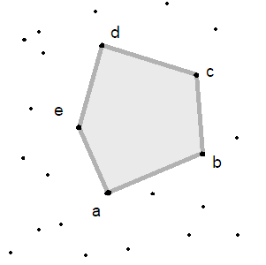 Why do we know that the shaded area is the interior of $P(a,b,c,d,e)$? There isn’t enough information right now to make this assumption. Jordan curve theorem states that an interior and exterior will always exist, but determining which is which is up to us. This is where the concept of orientation comes in. Normally we define all points in a clockwise or counter clockwise order. Once we do that, a polygon with its interior can be defined as:
