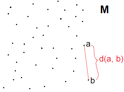 We are all adults here so let’s formalize things. A metric space is a set of objects $M$, which can be anything, and a distance function $d : M \times M \to \mathbb{R}$. So if you have a set of any thing of some type, and you can define a “distance” between any two things, you’ve got a metric space. The distance function is called a metric, and you use this metric to measure things beyond the distances between two objects in the set. The metric must satisfy these properties: