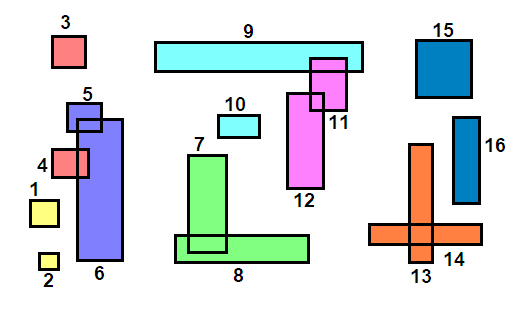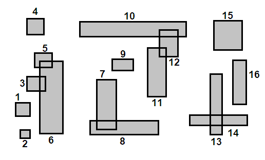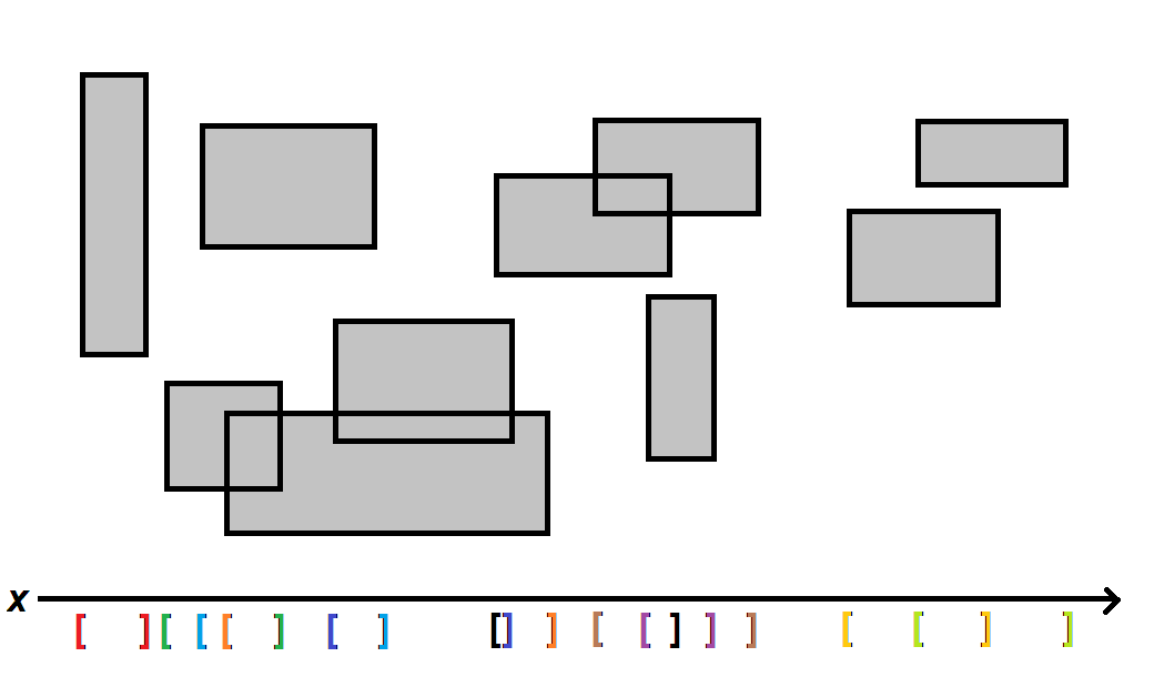 It seems obvious that no rectangle from the left cluser can intersect with any rectangle from the right cluster. What if we processed these clusters separately? There are $7$ rectangles in the first cluster and $8$ in the second. It would take $\binom{7}{2} + \binom{8}{2} = 49$ checks, compared to the standard $\binom{15}{2} = 105$.