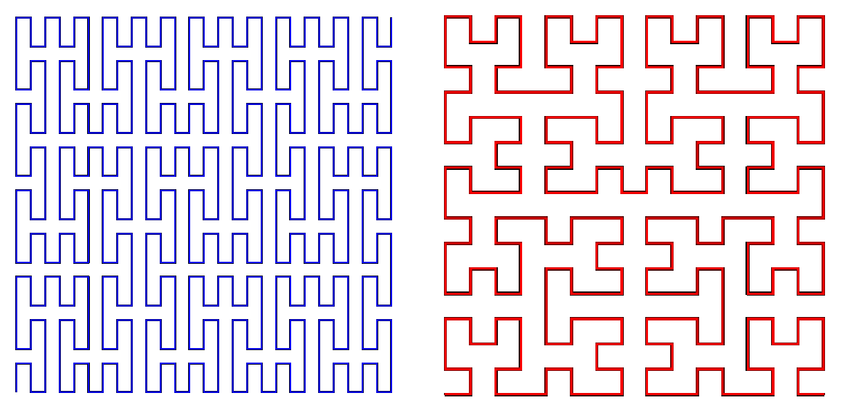Many space filling curves are fractals, like the Peano curve (left) and Hilbert curve (right). That’s helpful because the functions can be expressed recursively and thought about through iterations. The two images below are not the Peano and Hilbert curves, because they’re not really filling up the entire space. They’re the 3rd iteration of their curves. Each successive iteration fills up more space, so when $\text{iter} \to \infty$, the curve truly does fill up the entire space of a unit square.